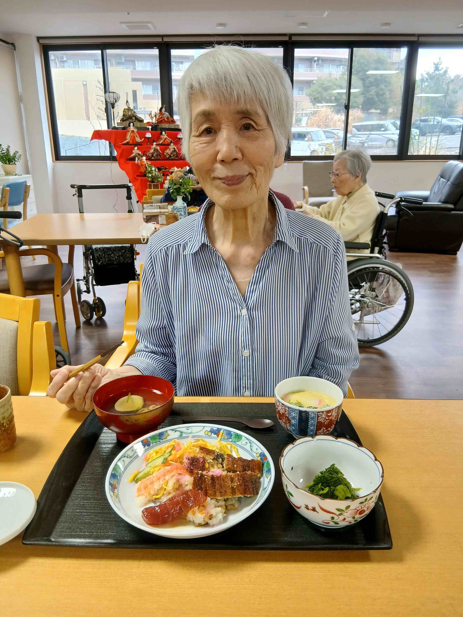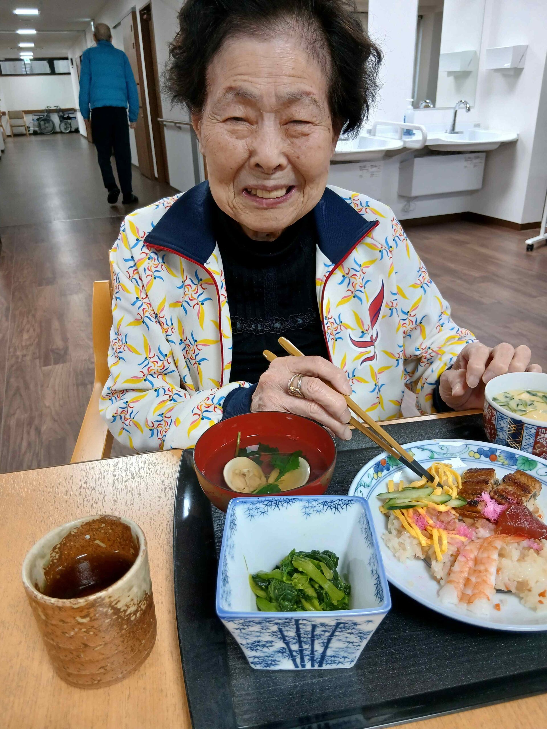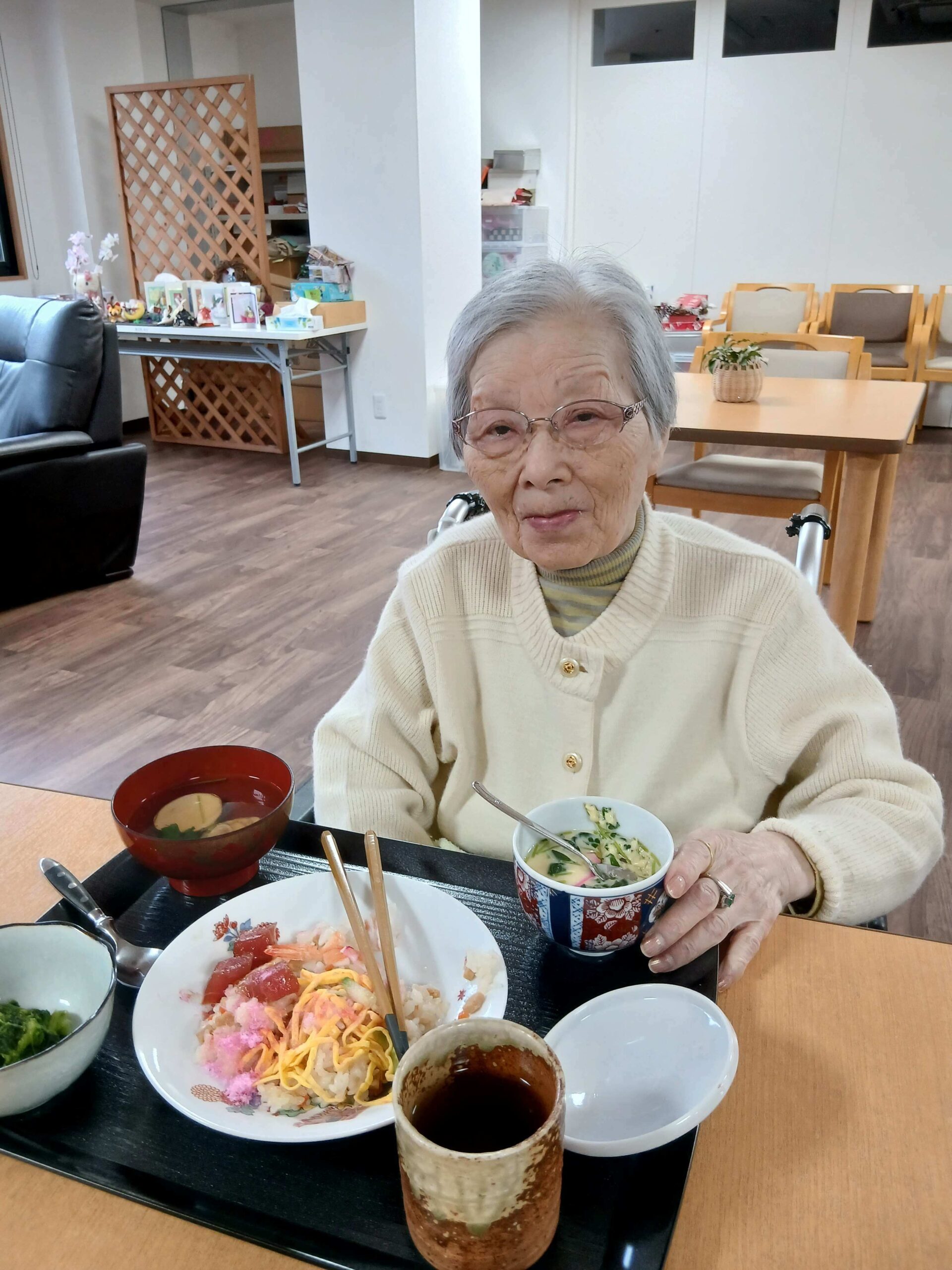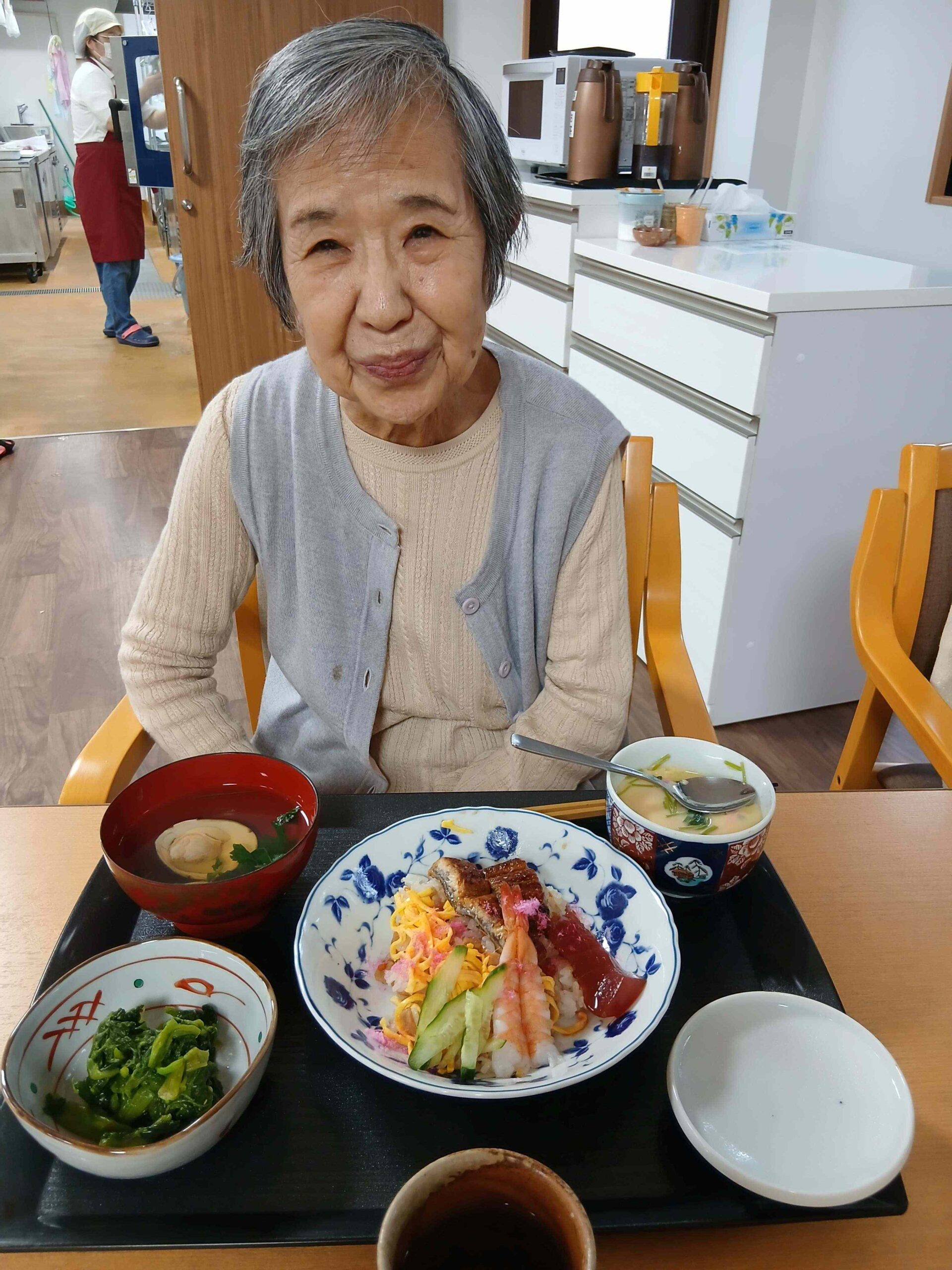 ちらし寿司に茶碗蒸し、菜の花のお浸し、蛤のお吸い物。
