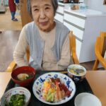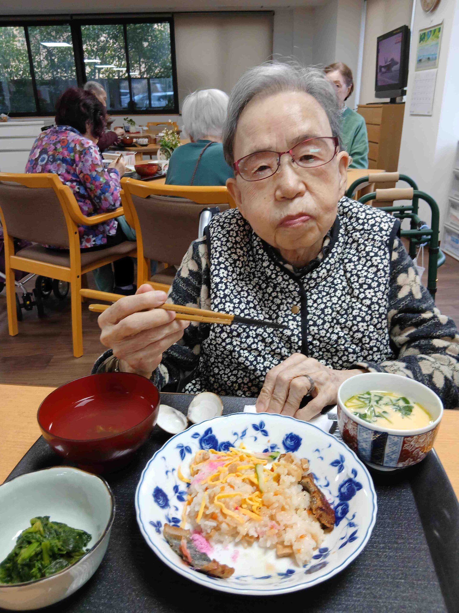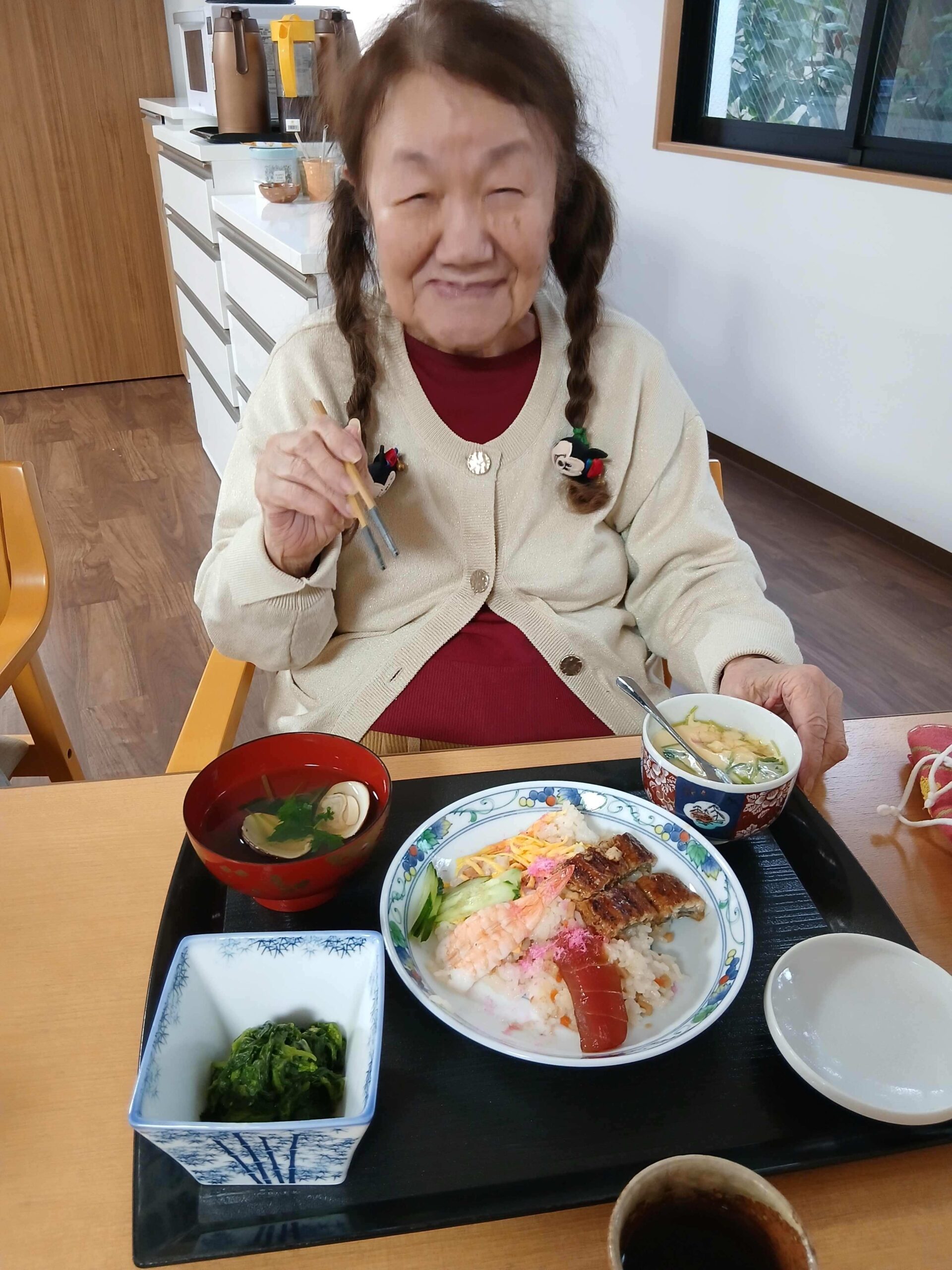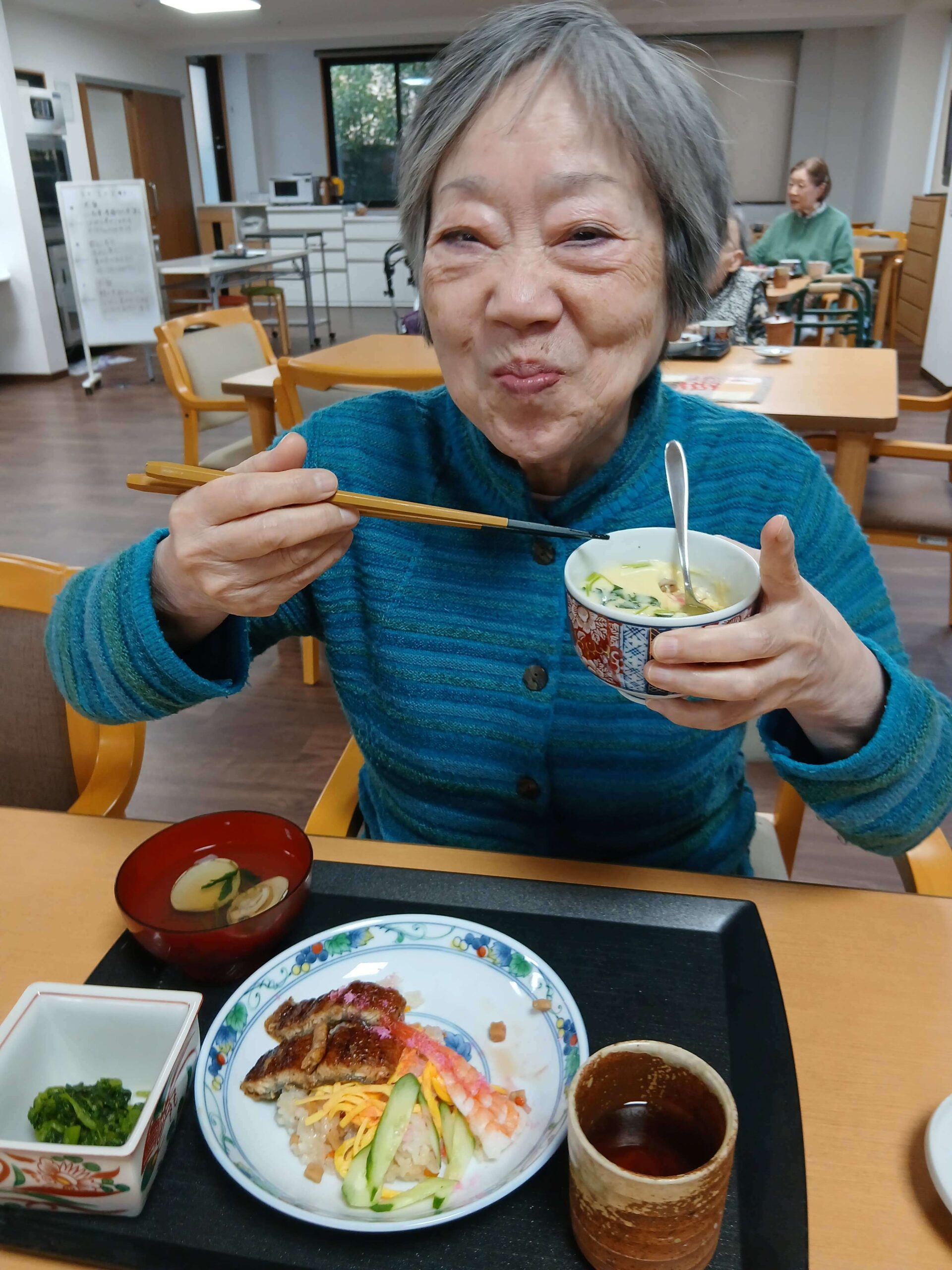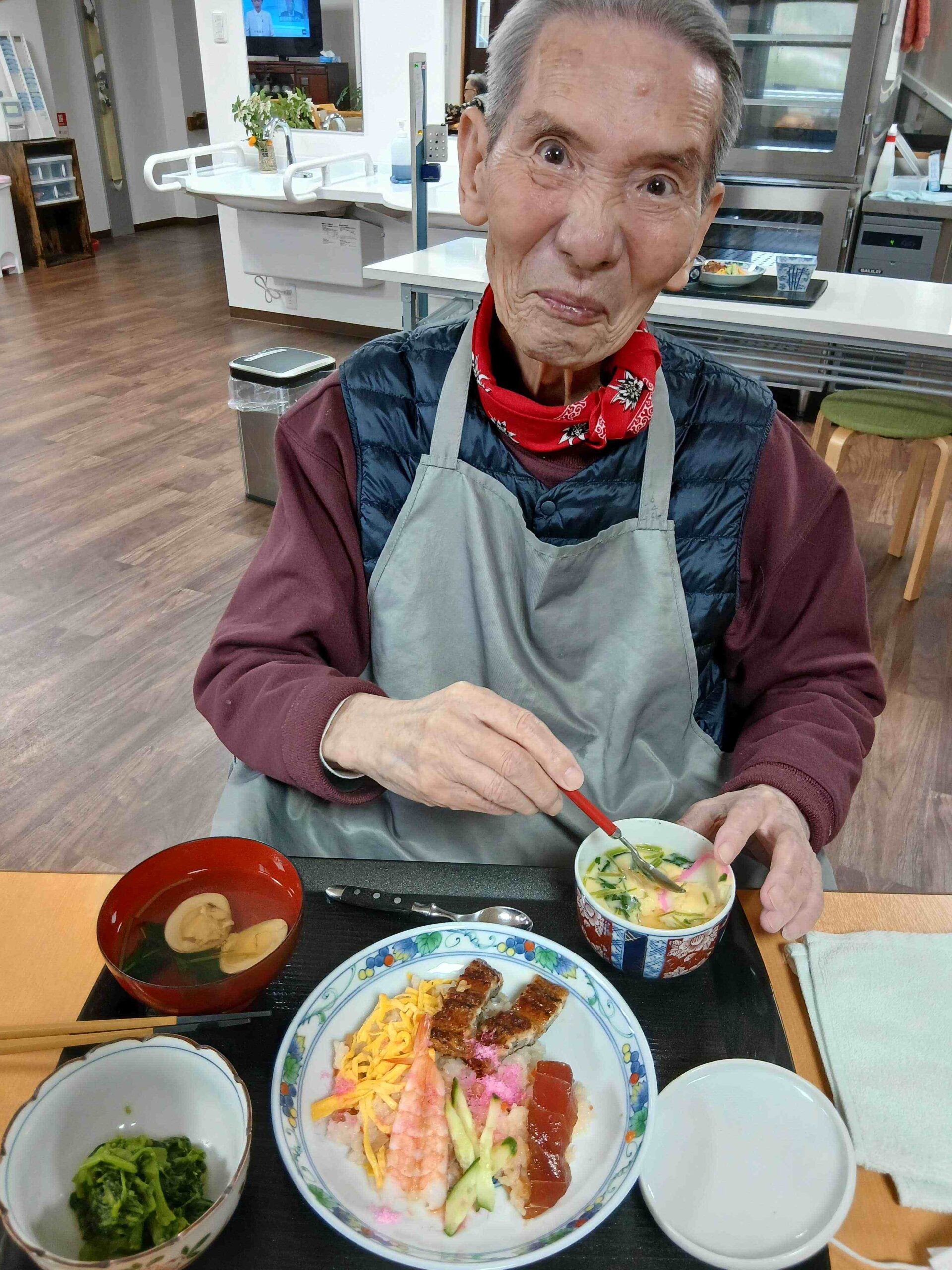 ちらし寿司に茶碗蒸し、菜の花のお浸し、蛤のお吸い物。